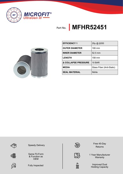 Genuine MicroFit® UltraGen III MFHR52451 filter. Engineered and manufactured in Great Britain the MFHR52451 is designed to meet or exceed the quality and performance of OEM quality standards, ensuring superior filtration performance and the longest possible filter life.Building on over 50 years of filtration expertise, the UltraGen III series is the third generation of MicroFit® filter media, delivering exceptional efficiency and reliability.