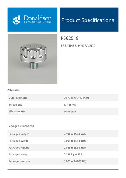 Genuine Donaldson P562518 Breather, Hydraulic is designed to provide reliable performance in breather, hydraulic applications. Built with high-quality materials, it ensures consistent functionality and durability.