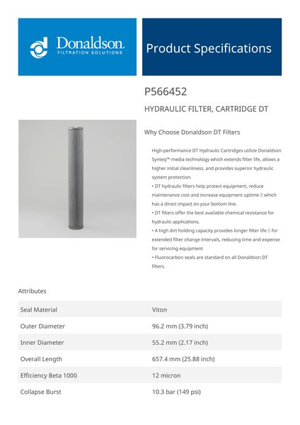 Donaldson P566452 Hydraulic Filter, Cartridge Dt | Replaces the Pall HC9400FHS26Z