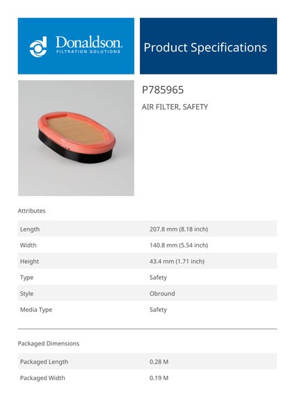Genuine Donaldson P785965 Air Filter, Safety acts as a crucial secondary layer of defense in your air filtration system, capturing fine dust particles that bypass the primary filter. This extra layer of protection helps prevent engine wear and supports consistent performance, especially in dusty or harsh environments.Compact and durable, this safety air filter operates without restricting airflow, complementing the primary filter for comprehensive engine protection. It’s essential for maintaining clean air intake and maximizing engine lifespan.